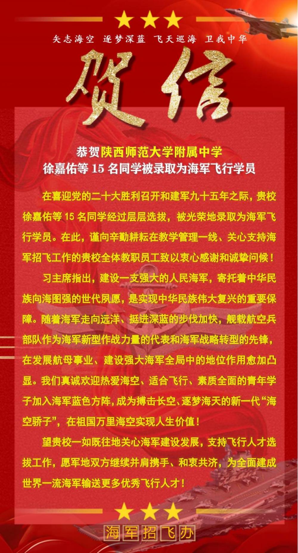 近日,海军招飞办向我校发来贺信,祝贺我校徐嘉佑等15名同学被录取为海军飞行学员。作为全国14所海军青少年航空学校之一,我校首届海军航空实验班学生在完成高中阶段学习的同时,并先后通过体格检查、飞行潜质检测、政治考核和高考等一系列考察,最终15名同学光荣地被录取为海军飞行学员,考入海军航空大学。我校首届海航班出飞率达到42%,位于全国第二,圆满完成各项培养任务。...