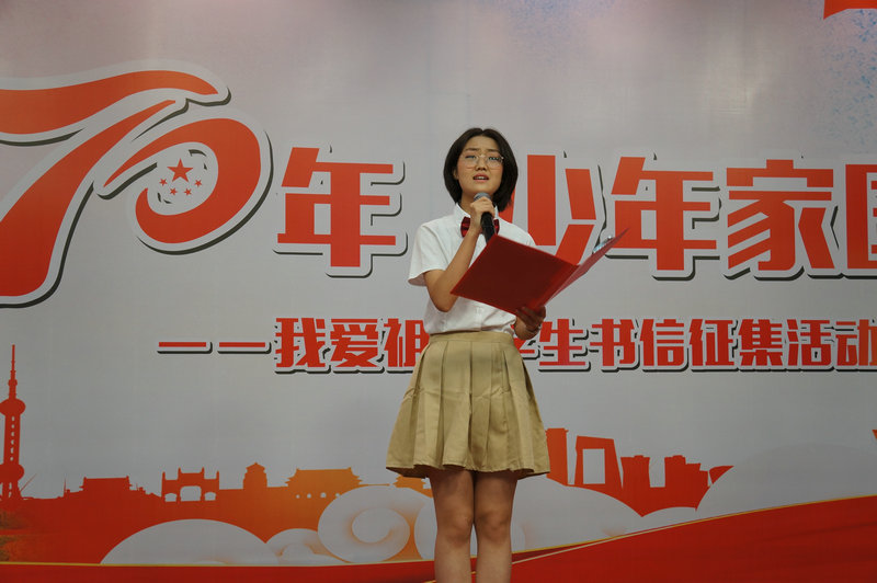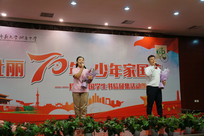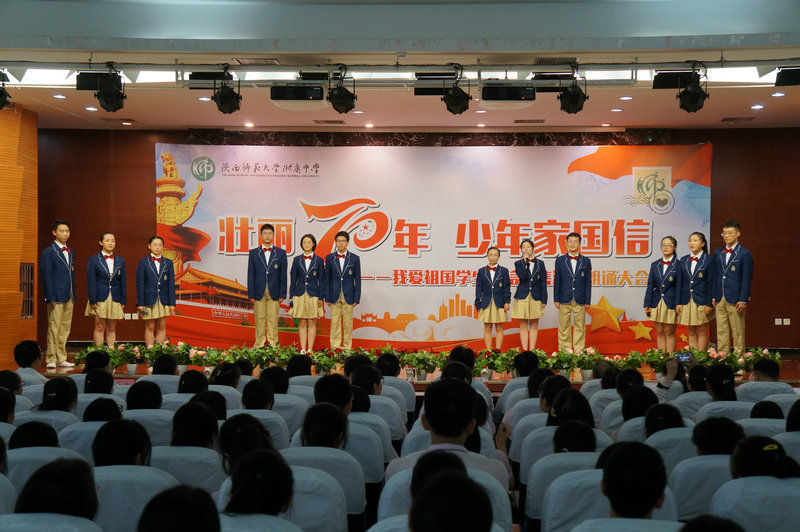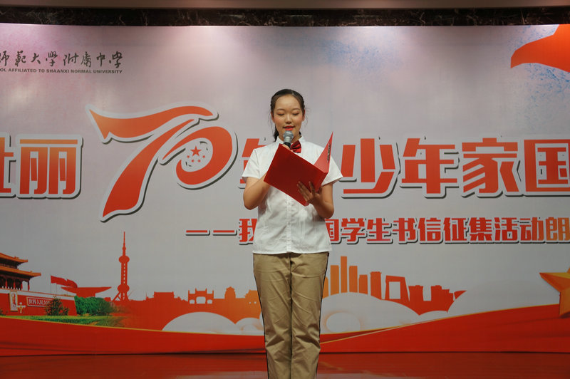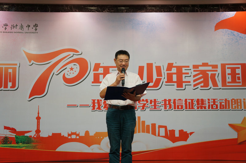 为培养青少年的爱国意识和家国情怀,传承中华民族优秀传统文化,引导青少年了解家史、党史、国史,大力弘扬以爱国主义为核心的伟大民族精神,值建国70周年之际,我校政教处于2019年9月11日下午,在综合楼报告厅举行《壮丽70年 少年家国信》——我爱祖国学生书信征集活动朗诵大会,我校冯军校长,副校长刘晓晴、张帆,沣西第二学校执行校长权小红,西安日报社副总编程建设,西安晚报阳光报总编万波,副总编韩文韬,陕西省朗诵协会副会长晓河,陕西广播电视台影视频道制片人许超,阳光网、魅西安,西安晚报等媒体代表,我校董翼主任、王建军副主任、刘建玲副主任、鲍青青副主任、符洁副主任、语文教研组组长万琼老师及初二、高二年级全体语文老师、高二年级全体班主任和学生参加了此次活动。
