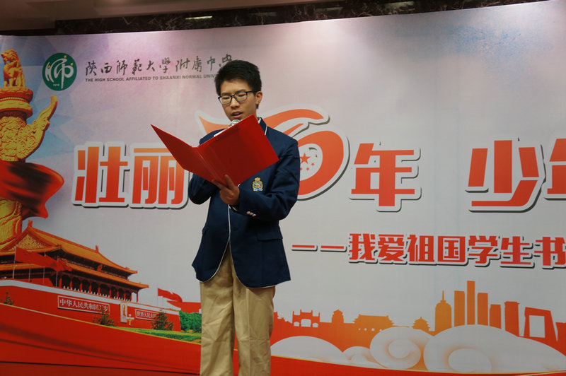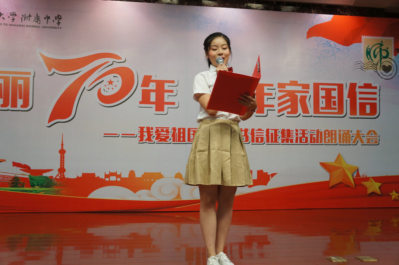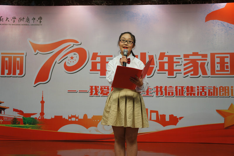 随后,陕西省朗诵协会副会长晓河为大家诵读了高二5班周佳奕的作品《我有幸》,晓河老师的诵读饱含真情,现场掌声此起彼伏,接着由我校11位广播站成员和语文教研组长万琼老师分别为大家诵读了参与此次书信征集活动的入围作品,他们是:高二1班张可璇的作品《亲爱的祖国》、高二7班李思哲的作品《我和我的祖国》、高二2班江碧薇的作品《祖国啊,我愿意做你的孩子和战士》、高二3班戴鑫艺的作品《奶奶爱上了手机支付》、分校韩静仪的作品《那时的奶奶是全西安最好饭堂的厨师》、高二3班徐伊诺的作品《与国漫共成长》、初二10班剡雪杭的作品《垃圾分类后再来看大美西安》、高二1班王子竹的作品《万水千山,你是最深的牵挂》、高二2班郭婧语的作品《祖国,我这样理解你》、高二5班向艺颖的作品《最美乐章》,各位诵读者声情并茂、铿锵有力、热情激昂的表现力时而将现场观众带去了祖国辽阔的田野、时而又让大家目睹了祖国70年来日新月异的发展与变化,大家用语言的艺术向现场观众传递着书信的思想内容,倾诉和表达着对未来、对梦想、对亲人的问候和祝福,对家乡、对祖国的满腔热爱,引起现场观众的共鸣。其中,我校高一3班罗今一与问丁元老师带来的一首《我爱你中国》掀起了此次活动的高潮,大家一起唱响红歌,轰动全场!
