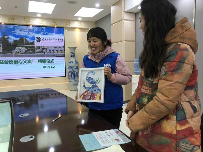 2020年1月2日,“拉拉手公益台历爱心义卖”捐助仪式在我校崇是楼会议室举行,西安拉拉手特殊儿童教育中心金阳利老师、我校政教处副主任鲍青青、陈静文老师、学生会代表杨以哲、王佳仪、王一帆、路漫漫参加了此次活动。