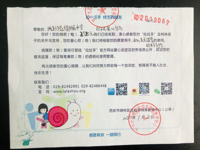 最后,金阳利老师向我校赠送了西安拉拉手特殊儿童教育中心孩子们亲手制作的装饰画;我校鲍青青副主任将此次活动筹集的全部善款捐助给西安拉拉手特殊儿童教育中心,为此次活动画上了圆满的句号。真心希望有更多的学生能够投入志愿服务活动,做乐于助人、懂得感恩的新时代好青年。