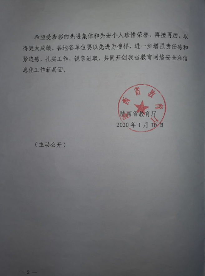 近日,陕西省教育厅印发《关于表彰2019年全省教育网络安全和信息化工作先进集体和先进个人的通知》,我校荣获“2019年全省教育网络安全和信息化工作先进集体”称号。冯军同志被授予“2019年全省教育网络安全和信息化工作先进个人”荣誉称号。