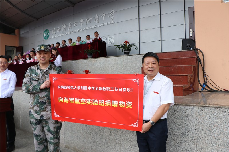 中共陕西省委宣传部办公室副主任吕焰代表省委宣传部向我校捐赠了图书。国防科技大学信息通信学院试验训练基地副主任王飞向我校海军航空实验班捐赠了物资。