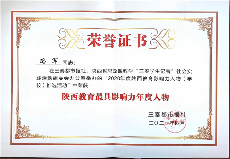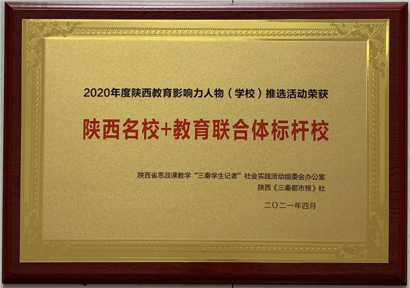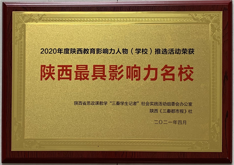2021年4月,我校在三秦都市报社、陕西省思政课教学“三秦学生记者”社会实践活动组委会办公室举办的“2020年度陕西教育影响力人物(学校)推选活动”中,荣获“陕西最具影响力名校”、“陕西名校+教育联合体标杆校”,我校冯军同志荣获“陕西教育最具影响力年度人物”,张辉同志荣获“陕西教育突出贡献人物”。