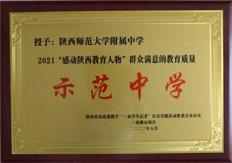 2022年5月,我校在陕西省思政课教学“三秦学生记者”社会实践活动组委会办公室、三秦都市报社举办的2021“感动陕西教育人物”全媒体推介活动中,荣获“改革创新力名校+共同体”“群众满意的教育质量示范中学”“陕西思政教育教学与社会实践突出贡献学校”,我校冯军同志荣获“陕西教育领军人物”。