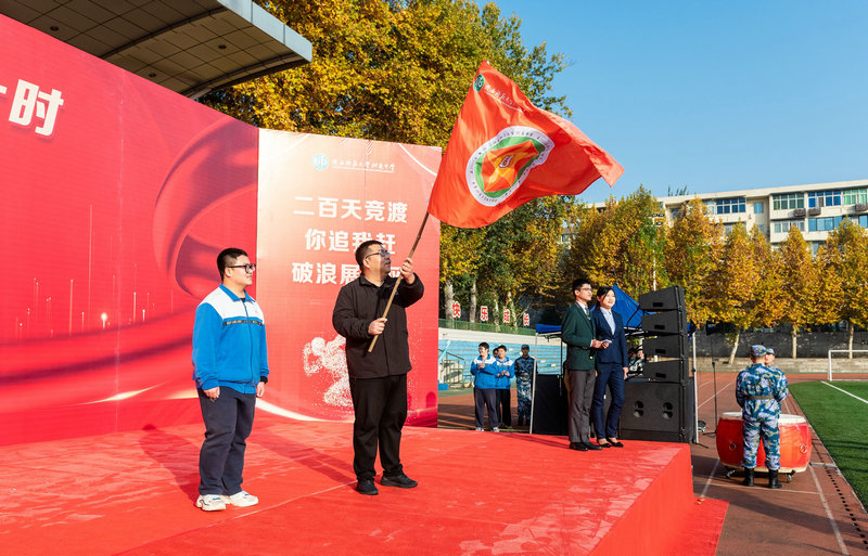 我校党委书记、校长冯军讲话。冯校长深情寄语全体高三学子“鲜衣怒马少年时,不负韶华行且知”。他强调,高考不仅是大家通往理想之境的必由之路,更是青年一代锤炼自我,立志报国,奉献社会的理想选择。希望大家能够在这关键的200天里坚定信念、自强不息、珍惜时间、把握时机,在未来的人生道路上一帆风顺,鹏程万里!