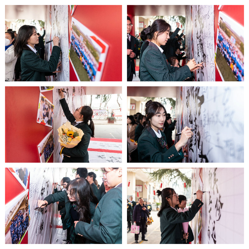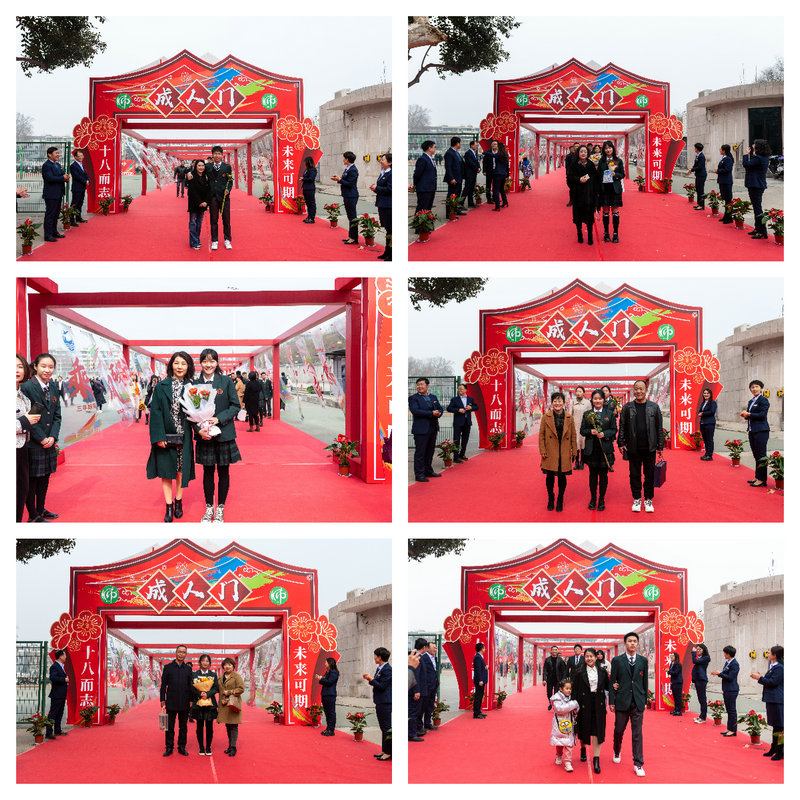 同学们身着正装,在家长、老师的陪同下,以青春昂扬的姿态,踏上红毯,庄重地走过成人门,在签名墙上留下了属于自己十八岁的记忆。