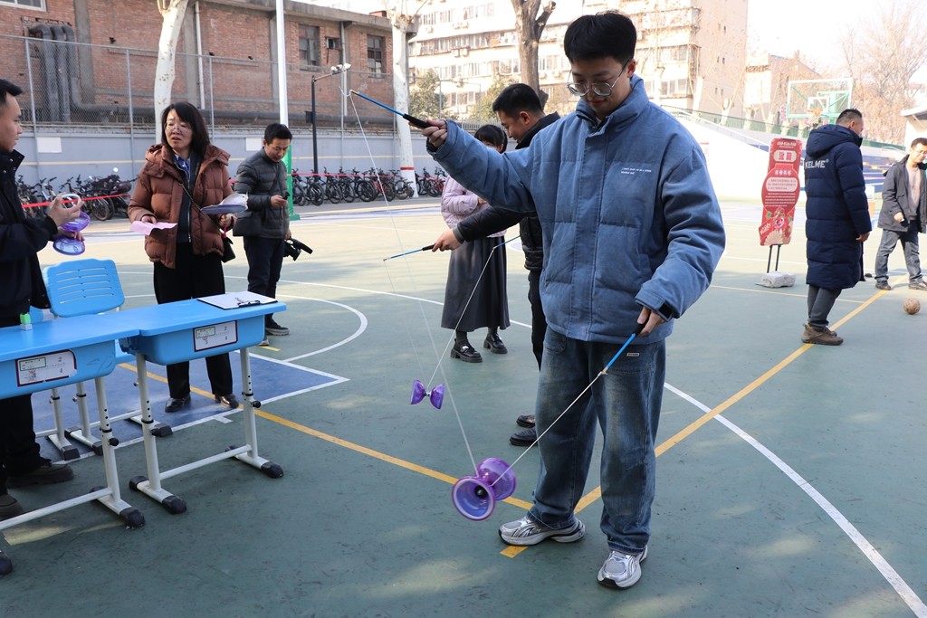 在制作冰糖葫芦体验区,教职工们亲手挑选山楂、串果、裹糖,制作出了一串串晶莹剔透、美味可口的冰糖葫芦。这一传统小吃的制作过程不仅让大家体验到了动手的乐趣,更让大家在品味美食的同时,对传统文化有了更深刻的认识和理解。此外,投壶游戏、传统文化知识竞答、传统射箭(礼射)、非遗手工DIY、抖空竹比赛、蹴鞠比赛以及掷沙包比赛等项目也各具特色,教职工们在参与中感受到了传统文化的多样性和独特韵味。