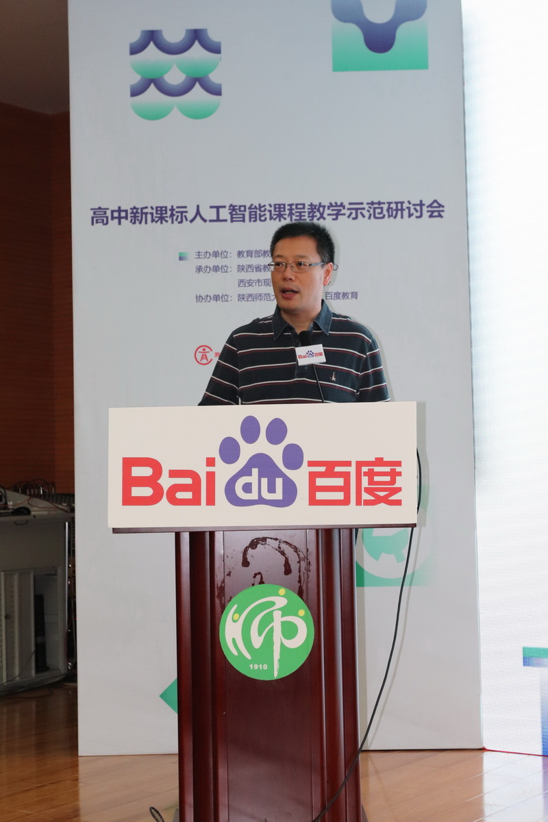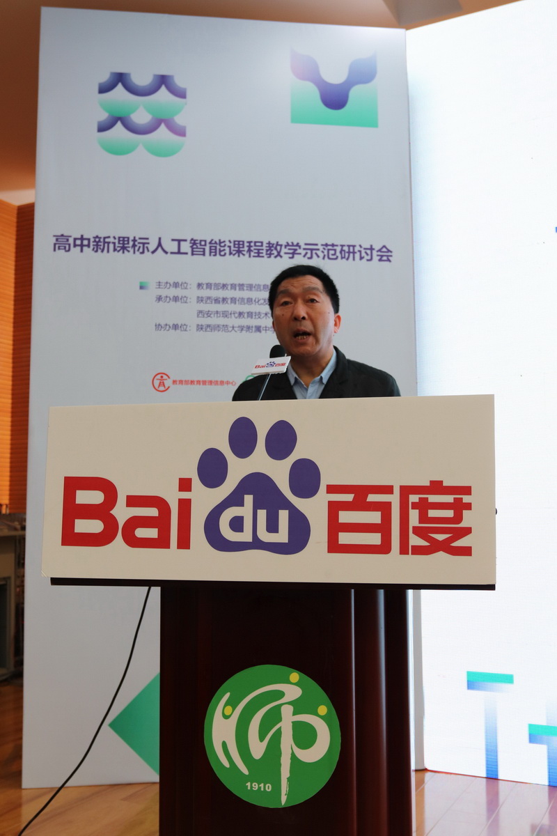 2018年11月12日,教育部教育管理信息中心主办,陕西省教育信息化发展中心、西安市现代教育中心承办的“高中新课标人工智能课程教学示范研讨会”在我校科技楼一层报告厅举行。参会的领导和专家有:教育部教育管理信息中心刘曦葳主任、陕西省教育信息化发展研究中心袁新瑞主任、西安市现代教育信息中心张西强主任,百度教育事业部张高总经理、以及我校冯军校长、陈勇刚书记、刘晓晴副校长。西安市180余位负责学校信息化教育工作的校长、信息技术教师参会。会议由张西强主任主持。