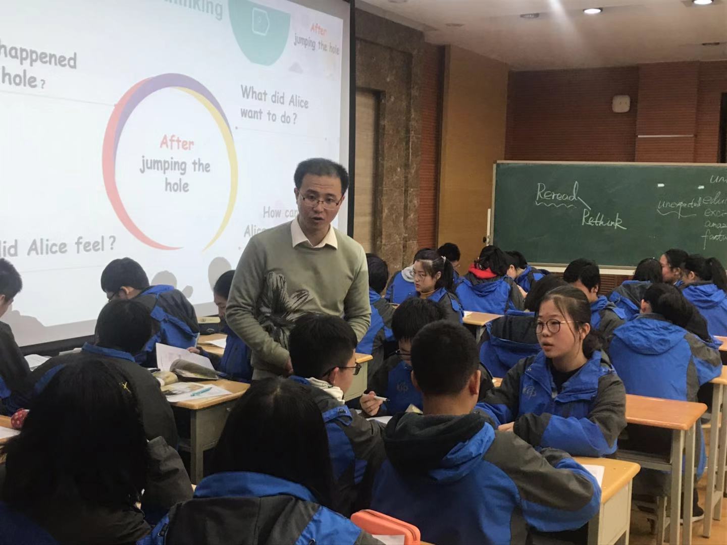 此次课堂观摩教学活动,分为初高中两个分会场,陕西师范大学附属中学英语教师焦洋洲及江苏省南通市施丽老师分别进行初中组观摩课展示,执教的内容为上海外语教育出版社出版的黑布林英语阅读《爱丽丝麽梦游仙境》分级阅读。陕西师大附中安文娟老师和江苏省西亭高级中学英语学科组长钱海军老师就《了不起的盖茨比》经典阅读呈现了两堂精彩纷呈的阅读课。我校焦洋洲老师此次大胆挑战主题解读阅读的新想法,新教法。采用DRTA阅读方式呈现教学主线。围绕“impossibilities”主题展开。安文娟老师的品读课,让学生在读中学,品中思,引发学生了解,研究,赏析小说主人公的人物性格更重要的是引领学生结合实际生活思考人生,使学生收获颇多。两位老师的展示课收到专家及各地教研员的一致好评,并为在座的老师就如何进行课外阅读教学提供了有价值有意义的思考。