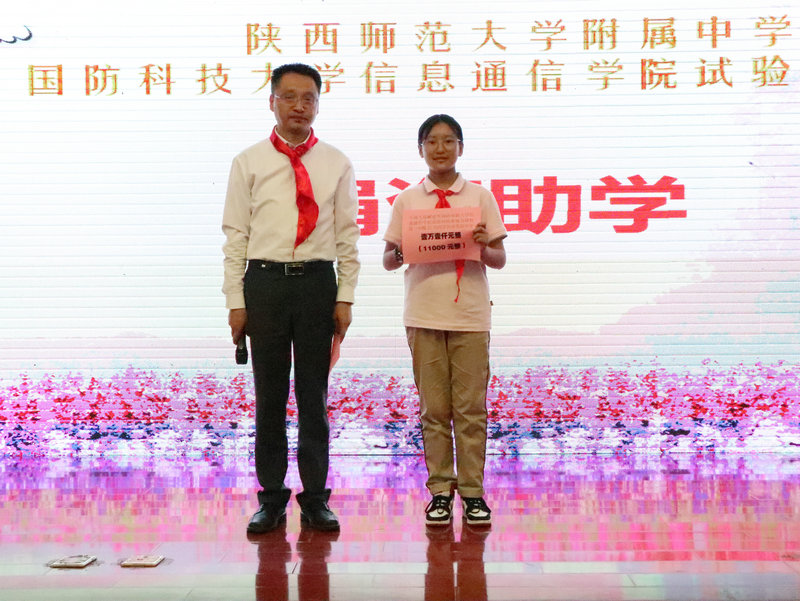 接着,党委书记陈勇刚及政教处主任权小红以及初一年级组长王芳老师为我校前期举办的初2021届 “平语近人,学习习近平总书记用典”主题手抄报及数学学科活动中获奖的学生颁奖,同时为我校初2021届的22位优秀同学发放了我校军民共建单位——国防科技大学信息通信学院试验训练基地提供的爱心奖助学金。陈勇刚书记为西安第二聋哑学校师生代表发放了由国防科技大学信息通信学院试验训练基地以及我校爱心团队捐助的爱心物品,随后,主持人邀请全场观众观看视频,大家共同回顾了我校爱心团队六年以来的义卖捐助活动,西安第二聋哑学校团委书记杨亮致感谢词。