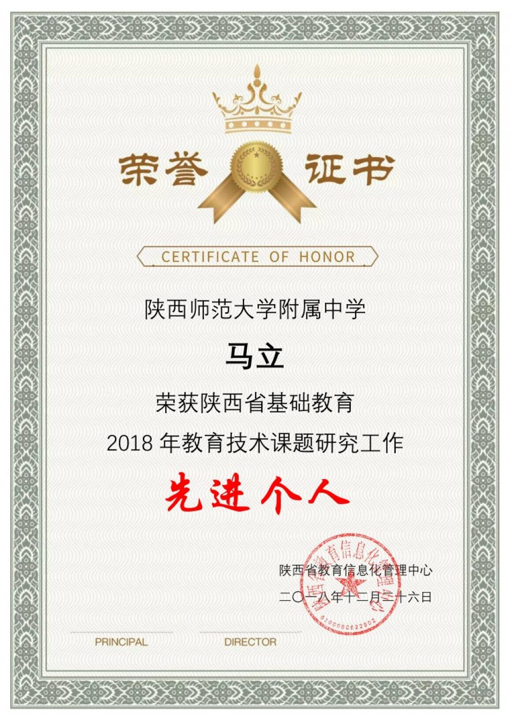马立老师荣获陕西省2018年教育技术课题研究工作先进个人
